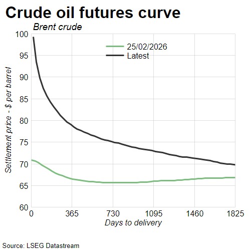但从原油期货的走势来看,这仍然不是市场的主要预测。今年及明年的布伦特原油期货走势显示价格正在逐步回归常态。对年底原油价格的加权平均预测为每桶84美元。尽管仍较2月水平高出10%至15%,但快速估算模型显示,这只会使全球GDP增长减少0.2至0.3个百分点。这还不足以让投资组合转入避险模式——无论对更广泛的通胀或政治后果有何看法。