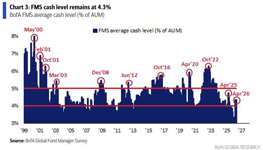 接受调查的基金中,不到10%预计未来将出现衰退。尽管上个月平均现金水平处于10个月高位,但仍明显低于去年4月关税冲击或2022年俄乌冲突期间的极端水平。