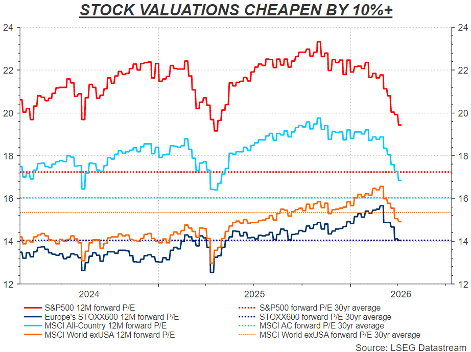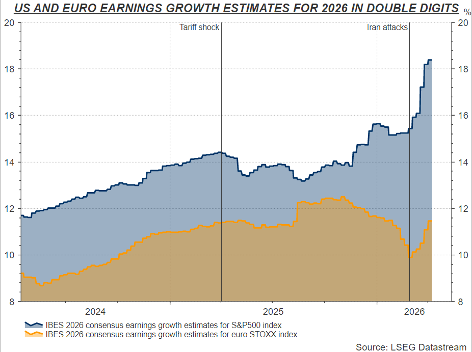 近几周来,投资者们广泛讨论的一个问题是,油价冲击对全年企业盈利预测影响之小。受科技公司和能源公司盈利预期上调的推动,自战争开始以来,2026年整体盈利增长预期反而上升了2至3个百分点;2027年美国及欧洲蓝筹股的盈利增长预期仍分别高达18%和11%。而与此同时,截至4月初的一个月内,标普500指数和MSCI全球指数未来12个月预期市盈率估值下降了超过10%。