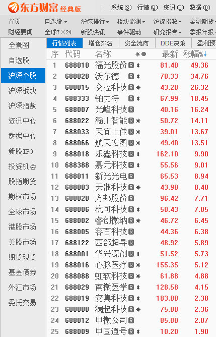 A股三大股指今天集体上扬,其中沪指收盘上涨0.80%,收报2923.28点;深成指上涨0.99%,收报9266.30点;创业板指上涨1.22%,收报1553.72点。两市合计成交4003亿元,行业板块呈现普涨态势。科创板25只股票今日全线收涨,福光股份强势领涨,收盘飙升49.36%。