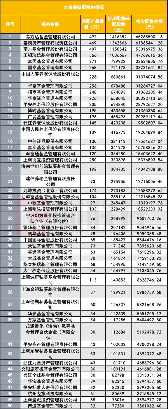 具体到管理人层面,头部公募依旧站在前列。据财联社记者统计,易方达基金此次共有492个产品获配,合计拿到141.64万股,对应获配金额6526.55万元。南方基金方面,旗下407个配售对象合计获配115.05万股,获配金额为5301.70万元。工银瑞信基金则有366个产品参与配售,合计获配103.67万股,对应金额4776.96万元。富国基金、国泰基金、华夏基金、招商基金、博时基金、广发基金、嘉实基金、海富通基金、汇添富基金、中欧基金等也均获得较大规模配售。