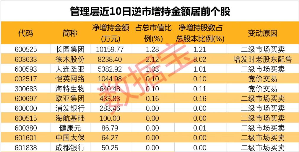 高管增持行为可在一定程度上代表管理层对公司状况的认可。数据宝统计,在7月14以来的大盘调整期间,11家A股公司获得了高管50万元以上的逆市净增持。除徕木股份的股东增持来自增发股份的老股东配售外,其余公司的增持均通过二级市场买卖或竞价交易完成。