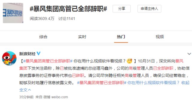 10月31日,深交所在对暴风集团的关注函中表示,“我部关注到除已被批准逮捕的总经理冯鑫外,你公司的高级管理人员已全部辞职,协助信息披露事务的证券事务代表也已辞职。” 深交所要求尽快聘任相关高级管理人员,确保公司经营稳定。在消息爆出后,“暴风集团高管已全部辞职”的话题迅速登上微博热搜前十名。