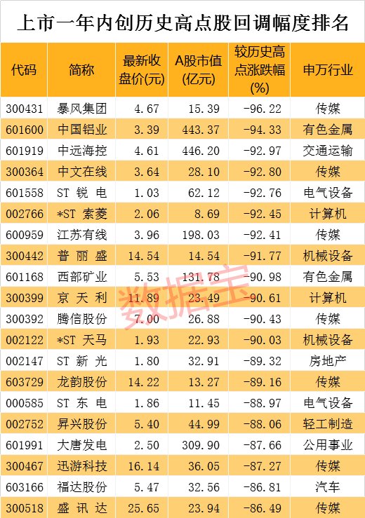 从回调幅度来看,包括暴风集团在内,共有12股较历史高点回落90%以上。回调幅度居前的还有中国铝业、中远海控、中文在线、ST 锐电等。