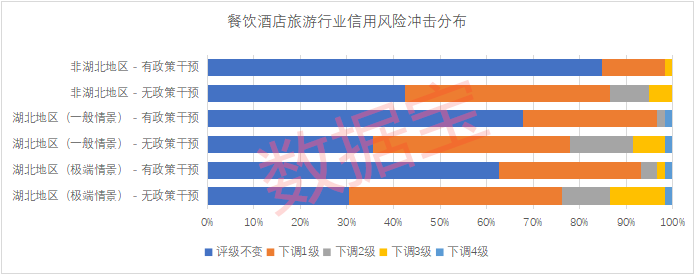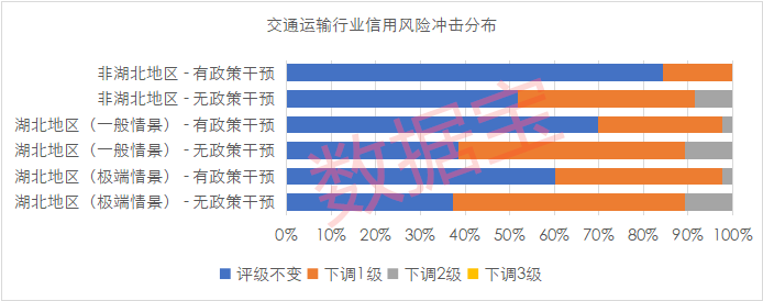 若有政策干预,整个行业的信用状况均将得到极大改善,评级不变的机构占比大幅提升,三种情景下的提升比例均超过30%,同时绝大部分的企业的负面冲击也将相对有限,避免进入恶性循环。