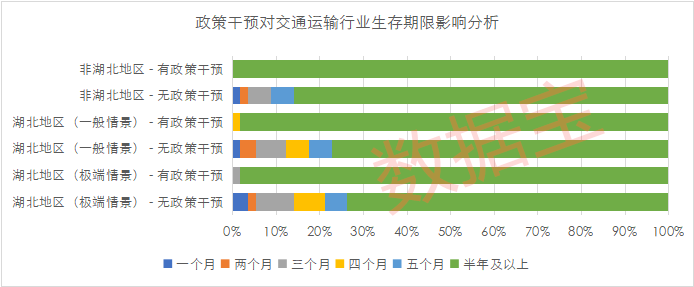 交通运输行业中非湖北地区约有14.04%的企业,湖北地区预计约有22.81%至26.32%的企业在2020年上半年资金枯竭,大部分在2020年4月至6月出现。