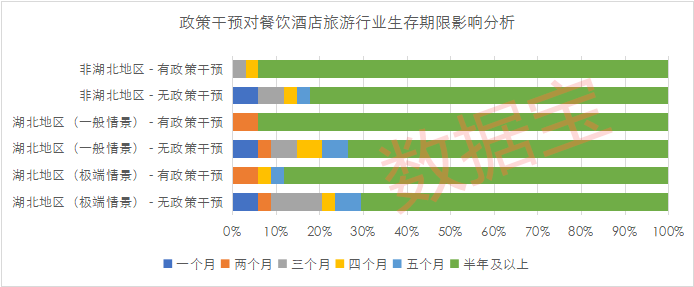 测算结果显示,若无政策干预,餐饮、酒店、旅游业中非湖北地区约有17.65%企业,湖北地区预计约有26.47%至29.41%的企业在2020年上半年资金枯竭;流动性枯竭企业增速将在4月份达到峰值。