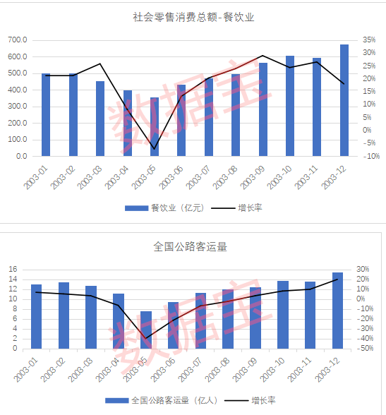 经济方面来看,非典时期中国经济处于飞速增长期,各类利好因素叠加,“非典”的出现并没有阻断2003年经济上行的大趋势。受疫情影响程度最深餐饮业和交通运输业的收入分别历时3个月和4个月恢复到疫前水平。