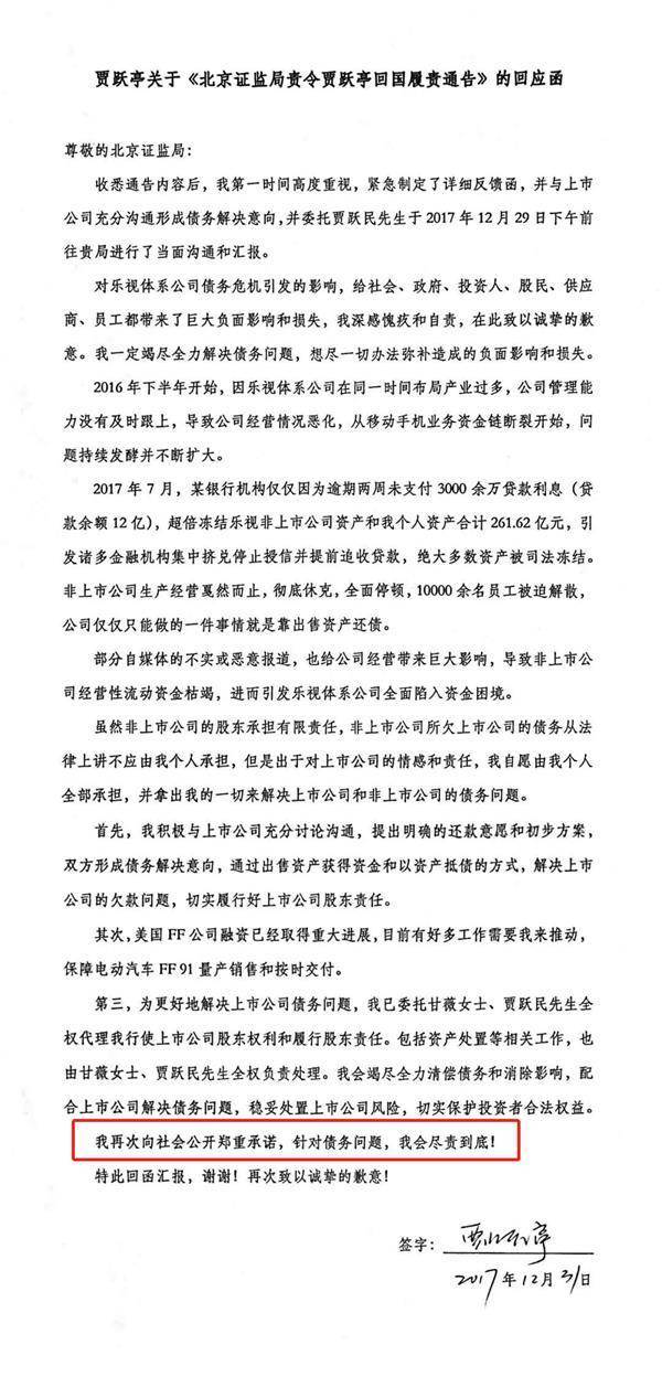 值得一提的是,财报显示,截至2018年底,在前十大流通股股东中,超级牛散章建平持股维持不变,为2488.34万股。2016年7月,章建平以定增方式进入乐视网,获配2488.34万股(后送转增至4976.67万股),共计耗费11.21亿元,复权后成本为22.5元/股。另外,在前十大流通股股东中,5个基金资产管理计划在2018年第四季度未做减持,到年底仍合计持有9155.58万股。东财Choice数据显示,截至2018年年底,共有7只基金产品持有乐视网,合计持有2368.38万股。从负责到底到全力造车乐视网走到目前的境地与贾跃亭密不可分。据披露,截至目前,乐视网对大股东及其关联方应收款项约28.4亿元。2017年12月25日,证监会北京证监局发布通告称,为保护上市公司及投资者合法权益,责令贾跃亭于2017年12月31日前回国,切实履行公司实际控制人应尽义务,配合解决公司问题,稳妥处置公司风险,切实保护投资者合法权益。北京证监局明确要求贾跃亭在见文后立即回国,稳妥处置公司面临的各种风险。但远在美国的贾跃亭并未回国。贾跃亭回应称,虽然非上市公司的股东承担有限责任,非上市公司所欠上市公司的债务从法律上讲不应由其个人承担,但是出于对上市公司的情感和责任,自愿由其个人全部承担,并拿出其一切来解决上市公司和非上市公司的债务问题。“我再次向社会公开郑重承诺,针对债务问题,我会尽责到底!”