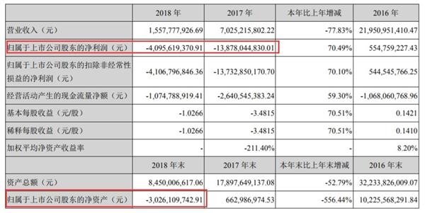 最终结果并不意外。乐视网称,经立信会计师事务所(特殊普通合伙)出具的审计报告确认,公司2018年度经审计归属于上市公司股东净资产为负。根据《深圳证券交易所创业板股票上市规则》13.1.6条规定,公司股票将自公司2018年年度报告披露之日起(即2019年4月26日开市起)停牌,深交所将在停牌后十五个交易日内作出是否暂停公司股票上市的决定。公司“满目疮痍”乐视网年报披露,2018年1-12月,公司实现营业收入15.58亿元,同比下降77.83%;实现归属上市公司股东净利润-40.96亿元,2017年为-138.78亿元。