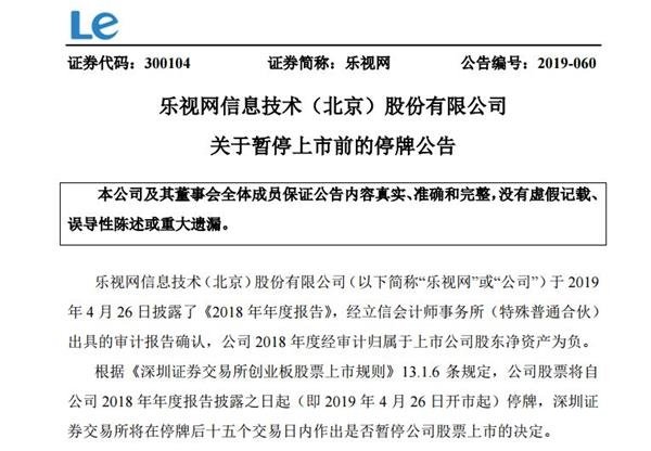 乐视网称,经立信会计师事务所(特殊普通合伙)出具的审计报告确认,公司2018年度经审计归属于上市公司股东净资产为负。根据《深圳证券交易所创业板股票上市规则》13.1.6条规定,公司股票将自公司2018年年度报告披露之日起(即2019年4月26日开市起)停牌,深交所将在停牌后十五个交易日内作出是否暂停公司股票上市的决定。(中国证券报)