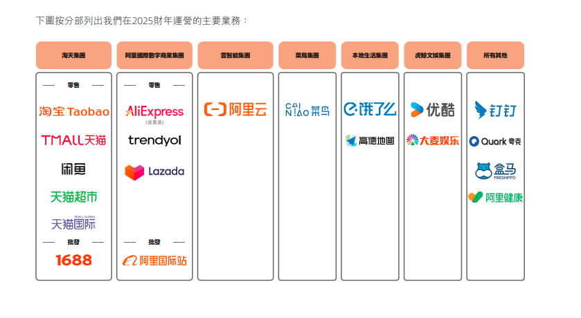 其中,阿里巴巴中国电商集团旗下电商类业务包括淘宝、天猫、闲鱼、飞猪旅行,即时零售业务包括淘宝闪购、饿了么,批发业务包括1688。