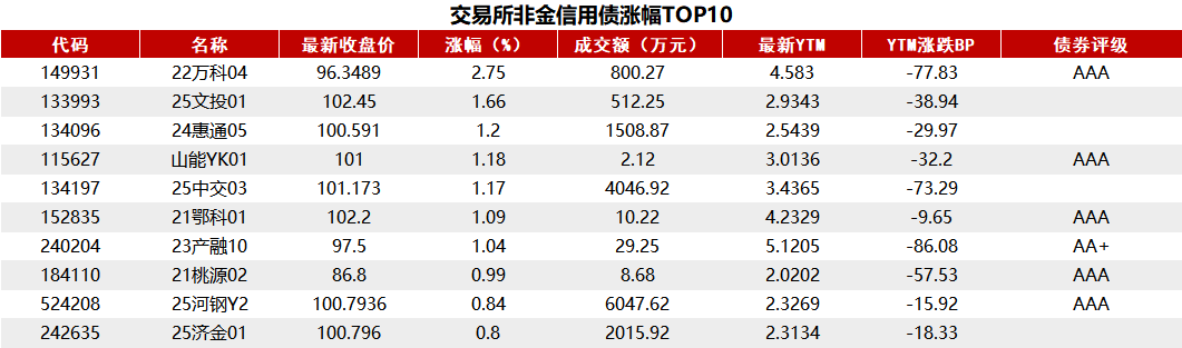 据Choice 数据统计显示,今日交易所市场非金信用债涨幅排行前五的分别是:22万科04、25文投01、24惠通05、山能YK01、25中交03。具体如下: