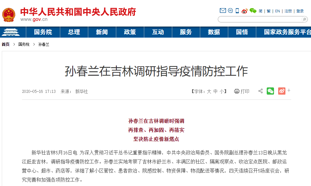 据新华社16日消息,为深入贯彻习近平总书记重要指示精神,中共中央政治局委员、国务院副总理孙春兰13日晚从黑龙江赶赴吉林,调研指导疫情防控工作。孙春兰实地考察了吉林市舒兰市、丰满区的社区、隔离观察点、收治定点医院、邮政运营中心、超市、药店等,详细了解小区管控、患者救治、院感控制、物资保障、物流配送等情况,四天连续召开5场座谈会,研究完善和加强各项防控工作。