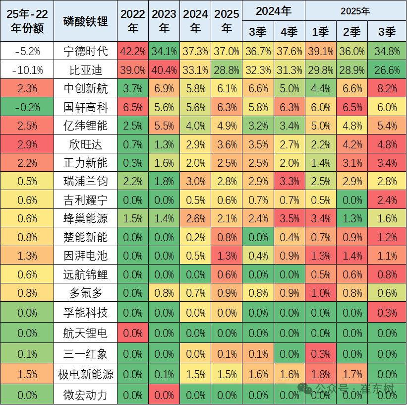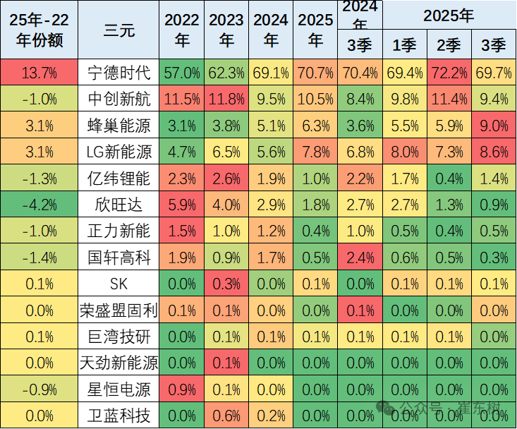 电池企业的竞争格局形成宁德时代和比亚迪两者相对较强的特征。宁德时代的2025年3季度占比下降到42%,比亚迪的占比从2020年的15%上升到2023年的26.9%,随后下降到今年3季度的21.4%;其它电池企业的占比也出现了明显分化的态势。电池企业形成了头部企业聚集效应放缓的特征,从2022年的头两家企业72%的比例,到2025年仍保持72%的比例,其它企业的空间有30%左右的空间。