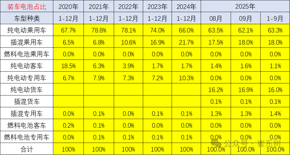 从电池装车占比看,近几年动力电池的需求结构在快速变化之中。2020年还是乘用车纯电动第一,纯电动客车第二,纯电动专用车第三的格局,而插电混动乘用车只是第四位的状态。而到了2025年,纯电动乘用车仍然保持第一位,而插电混动乘用车上升到第二位,纯电动货车上升到第三位,插混专用车上升到第四位,而纯电动客车下降到第五位的水平。