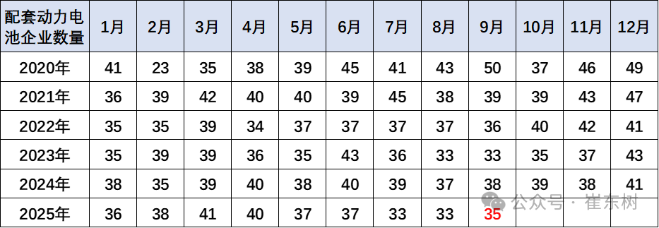 过去几年,电池市场的竞争格局并没有发生明显的变化,。2025年9月配套电池企业是达到35家的正常中底位。由于动力电池市场的技术进步相对比较缓慢,而规模增长特征相对明显,因此,电池企业获得了较强的生产和装车数量增长的特征。