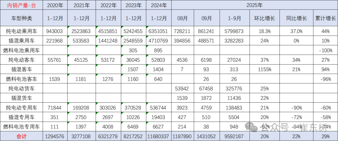 2025年9月的新能源汽车合格证产品产量是143万台、同比增22%。2025年1-9月新能源车国内合格证959万台、同比增29%较强,其中纯电动乘用580万台、同比增44%;插混乘用车328万台、同比增10%;纯电动专用车和货车46万台,这样的产量数据表现很强。