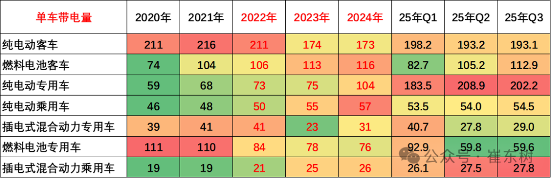 2025年3季度的电池能量密度160以上的车型占比7%,相对于2024年的11%出现了明显的下降,这主要还是磷酸铁锂电池对三元替代带来的能量密度下降。而125以下的能量密度的产品2025年下降到了1%的比例。