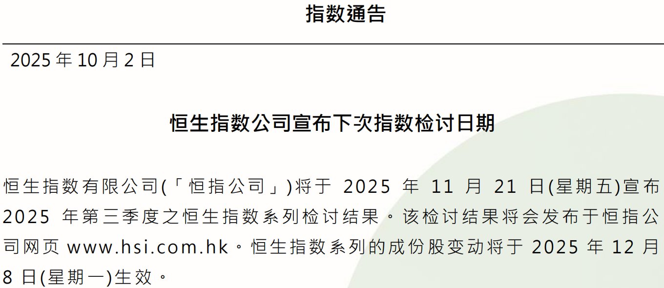 10月2日,恒指公司公告,将于2025年11月21日(星期五)宣布2025年第三季度之恒生指数系列检讨结果。恒生指数系列的成份股变动将于2025年12月8日(星期一)生效。