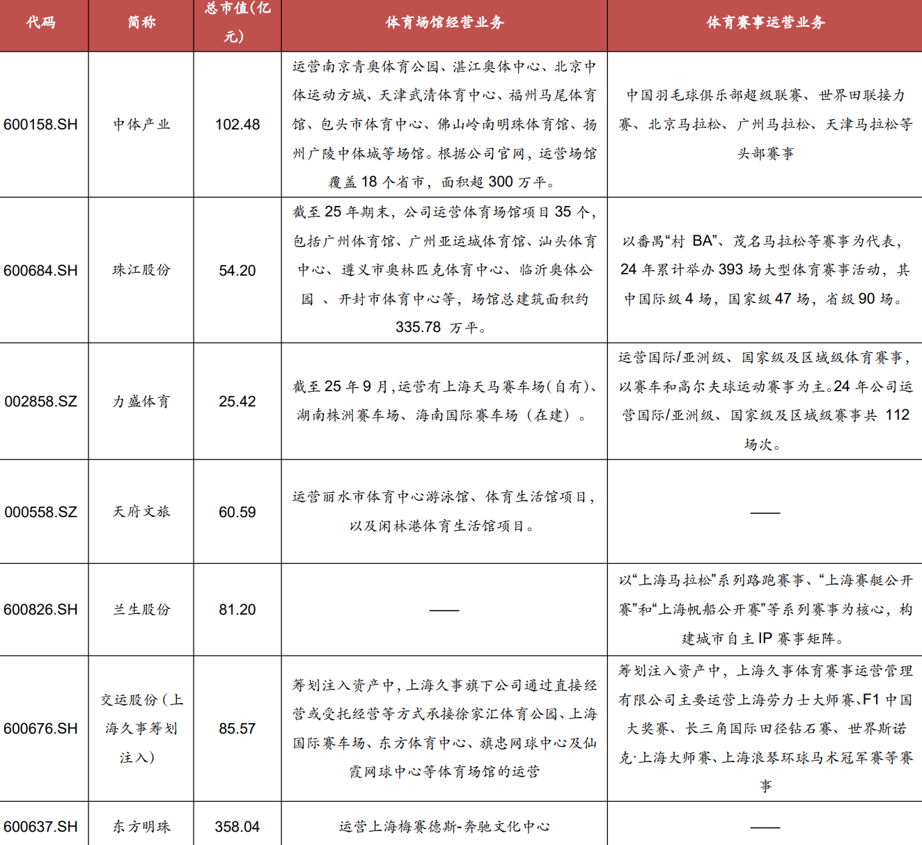 体育场馆经营,体育场馆作为赛事经济的流量入口,头部场馆是产业链中较稀缺的核心资源。2025年大型体育场馆(贵阳奥体中心、西安国际足球中心)经营权的转让案例、近年国内场馆(南京青奥体育公园、成都凤凰山体育公园、大连梭鱼湾足球场)的冠名案例。从这些案例中发现,地方头部场馆的经营权极其稀缺价值巨大(如贵阳奥体中心一期 20年的经营权在 25 年以总金额 23.75 亿元转让,24 年洋河以 10 年 2 亿元冠名南京青奥体育公园),底层逻辑在于核心场馆是线下赛事经济的核心流量入口。我们认为随着未来赛事经济的持续发展,体育场馆经营权的商业价值也将逐步被市场发现。