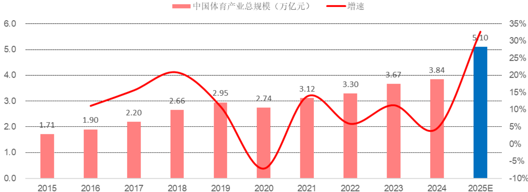 根据国家统计局和国家体育总局发布的数据,2024 年我国体育产业总规模已突破 3.8 万亿元,同比增长约 4.6%。从近年发展轨迹来看,中国体育产业呈现出稳健增长的态势:预计 2025 年突破 5 万亿元的目标,同比增速或超 30%。2025 年体育用品市场规模预计 2.49 万亿元,同比+8.7%。2025 中国体育赛事活动场次预计超 1200 万场,同比+25.6%。2030 年全国体育产业总规模预计有望突破 7 万亿元,行业保持较快 CAGR。体育产业增加值从 2012 年至 2022 年年均增速达 15.4%,远 高于同期 GDP 年均增速,充分显示出体育产业的巨大发展潜力。