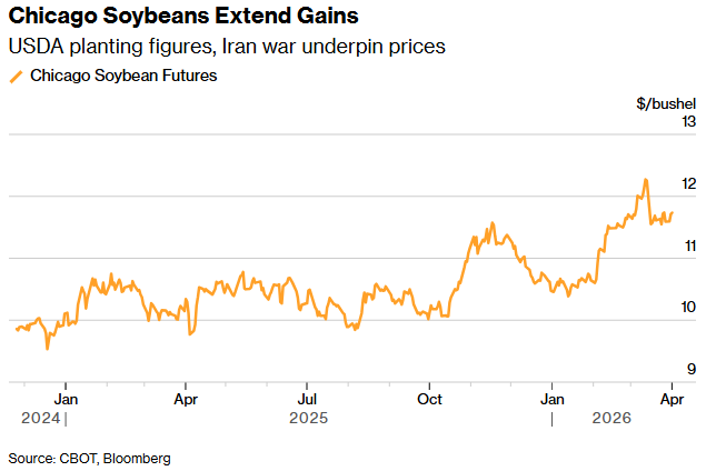 在美国农业部报告的大豆种植面积为 8470 万英亩,令交易员感到失望后,大豆价格进一步扩大涨幅。小麦种植数据为 4380 万英亩,同样低于分析师的预估。