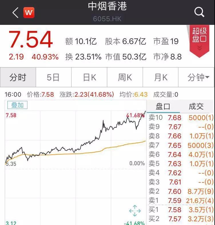 “烟草明星股”中烟香港今日股价暴涨,收盘大涨近41%,收盘报7.54港元,总市值突破50亿港元。相比4.88港元的发行价,目前股价累计上涨达到54.5%。作为“烟草第一股”,中烟香港发售价为4.88港元,获得102.04倍超额认购,上市后连续两日受资金追捧,上市首日即上涨近7%,盘中涨幅还一度达到20%。