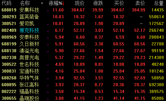 光刻胶概念30日盘中再度活跃,截至收盘,安集科技大涨逾11%,蓝英装备、爱司凯涨停,雅克科技、安泰科技、久日新材、清溢光电、奥普光电等涨幅超5%。