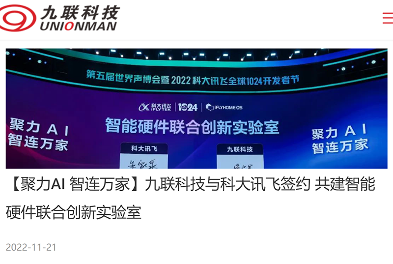 九联科技在2022年11月21日宣布,公司与科大讯飞签约,共建智能硬件联合创新实验室,通过AI赋能,推动智慧家庭产业发展;开展基于远场语音前端处理算法、智能语义NLP(自然语言处理)、全屋智能语音等关键技术的研发合作,致力于提供智能语音交互一体化、全屋智能语音的解决方案。