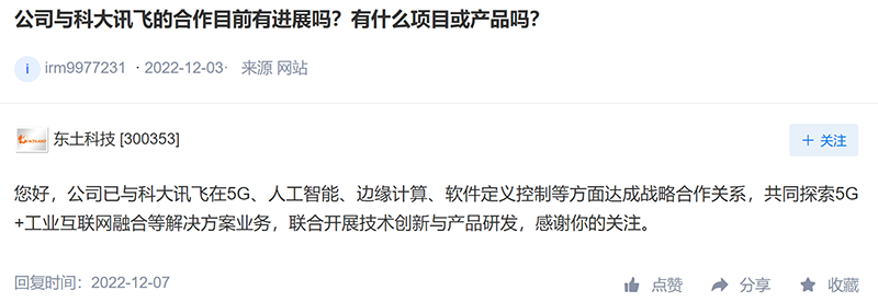东土科技于2022年12月7日在互动平台表示,公司已与科大讯飞在5G、人工智能、边缘计算、软件定义控制等方面达成战略合作关系,共同探索5G+工业互联网融合等解决方案业务,联合开展技术创新与产品研发。