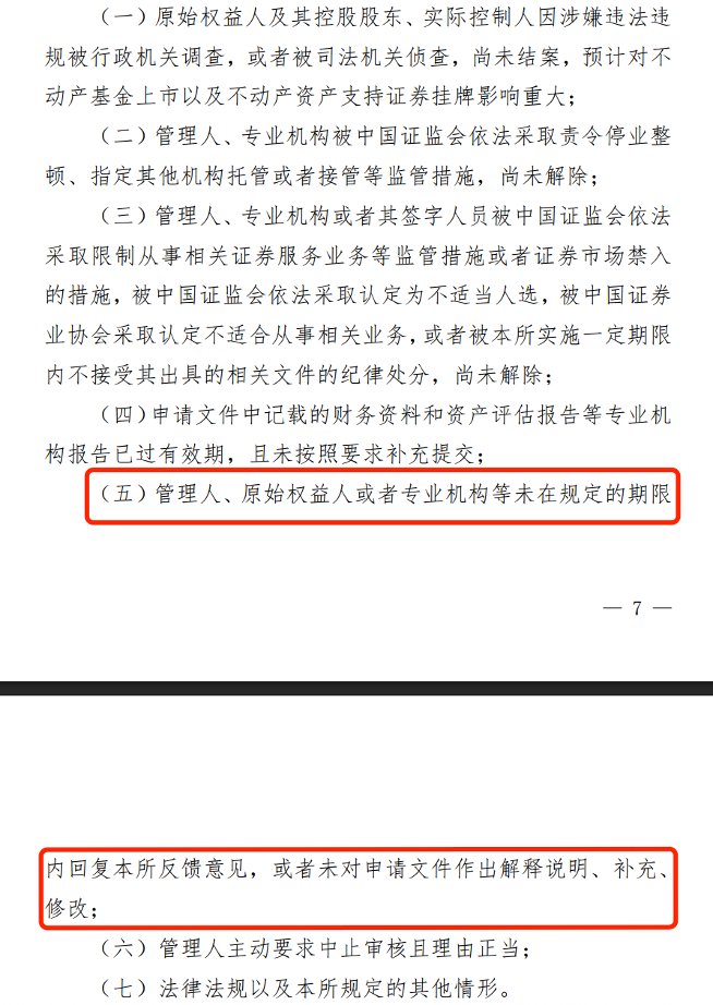 内容包含审核程序、扩募、新购入不动产等在内的一揽子业务规则,当中有条款明确公募REITs审核可以终止的若干具体情形,其中就包括申请人未在规定期限内回复交易所反馈意见、申报文件中的财务资料和资产评估报告超过有效期而未补充等。