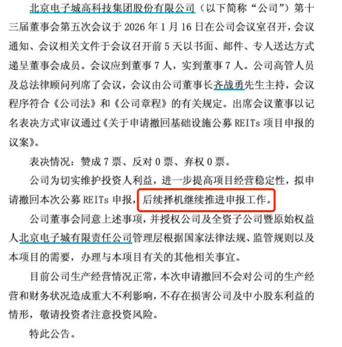 电子城的情况在路径上高度相似。其产业园REIT于2025年5月申报上交所,同年7月交易所下发反馈意见,此后再无实质进展。公司在最新公告中强调,撤回申报是为了维护投资人利益、提高项目经营稳定性,未来择机再推进。不少业内人士注意到,电子城同期披露的2025年业绩预亏公告中,对主业盈利承压做了较为详细的说明,这也让外界对其REITs底层资产未来的现金流稳健性产生更多疑问。