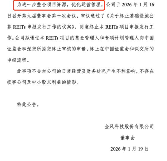 公募REITs走到常态化发行的第六个年头,市场迎来“终止案例”。金风科技公告终止公募REITs申报发行,这也是公募REITs市场首次出现已进入交易所审核阶段、却在审核链条中止步的项目。几乎同一时间,电子城亦公告拟撤回基础设施公募REITs项目申报,后续择机继续推进。