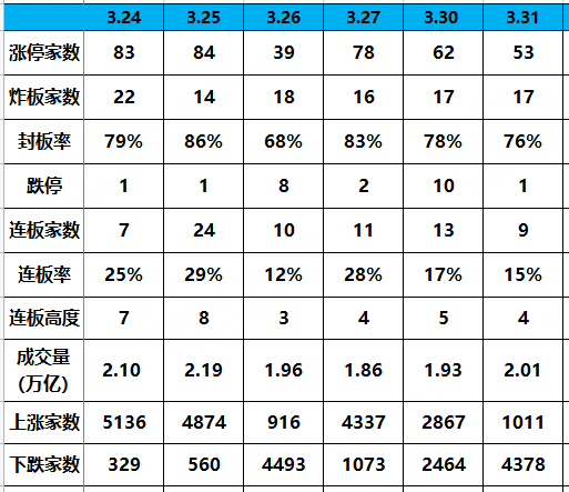 【总结】:情绪从过去的冰点和沸点慢慢的过渡到温水煮青蛙的行情了,希望四月会好一点吧。如果是温水煮青蛙行情,我复盘没啥写的,大家盯盘没啥买的,天天收盘收都拍大腿,后悔今天为啥不空仓。看似每天都有涨停板,但是涨停票是别人的,亏钱是自己的。低吸的票还能跌停,冲高的票总是回落,好不容易买个横盘的票,情况好点就横着不动,情况不好出个业绩雷又是跳空低开。