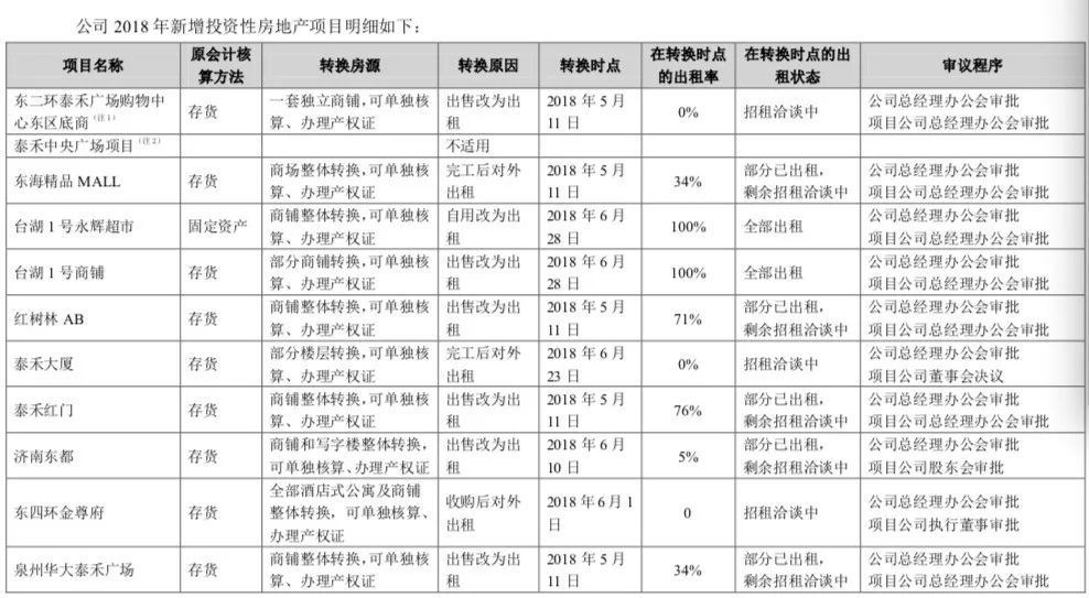 此外东海泰禾购物广场项目等也是如此,于2017年12月开始陆续竣工转入投资性房地产核算,部分 2017年转入的投资性房地产于2018年8月21日开始出售,当年年底该项目出租率为64%。