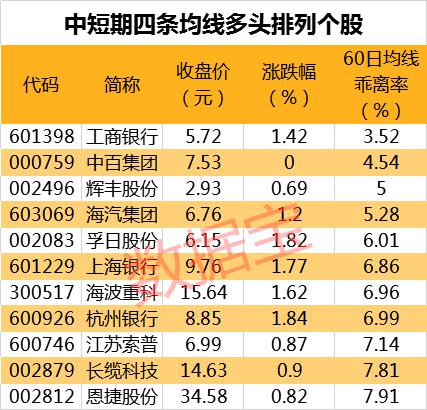 数据显示,175只个股5日、10日、20日、60日四条均线近日呈多头排列。其中工商银行(601398)、中百集团(000759)、辉丰股份(002496)股价与60日均线的乖离率最小,分别为3.52%、4.54%、5%。