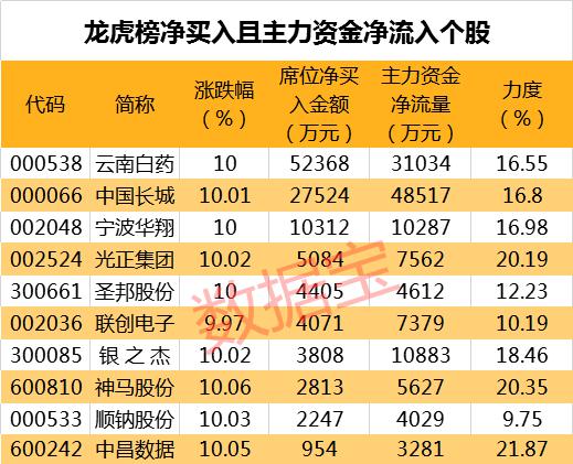从盘口资金流向来看,主力资金净流入超千万且龙虎榜净买入个股共有10只,其中中国长城、云南白药、银之杰(300085)等个股资金净流入金额最大。净流入力度最大的个股有华信退(002018)、中昌数据(600242)、神马股份(600810),净流入力度分别为33.99%、21.87%、20.35%。