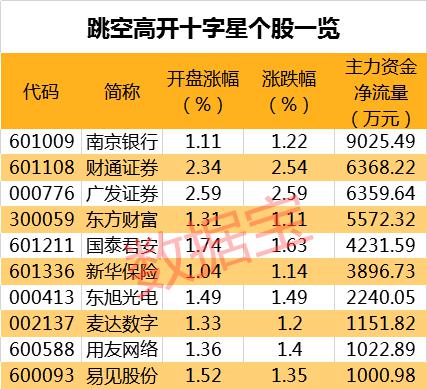 截至最新收盘,两市共有80只个股日K线出现跳空高开十字星形态,当天涨幅较大的是凯普生物(300639)、川恒股份(002895)、东信和平(002017),涨幅分别为4.25%、3.62%、3.05%。