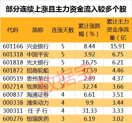 值得注意的是,1201只连续上涨个股中,33只个股期间主力资金累计净流入超过亿元。其中,累计资金流入最多的为兴业银行(601166),主力资金累计流入15.91亿元。(数据宝范璐媛)