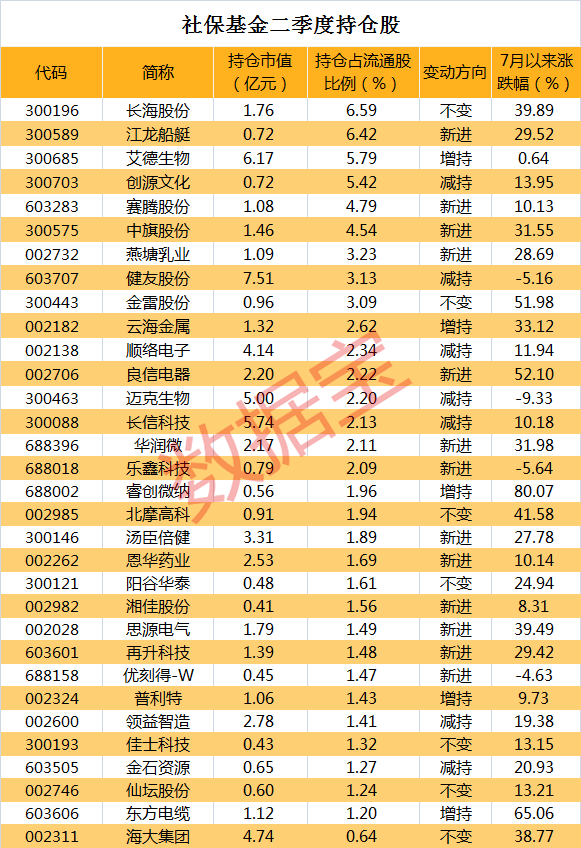 4只社保基金重仓股7月以来股价涨幅已超过50%