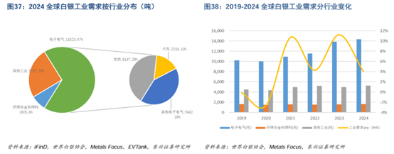 就工业需求而言,2019-2024年间,白银市场需求持续扩容。全球工业用银由2019年的16281吨增长至2024年的21165吨,期间增长了4884吨,占2019-2024 年间白银需求总增长量比例高达98%。从年复合增速来看,工业白银需求期间CAGR为5.4%,增速亦高于白银总需求增速。