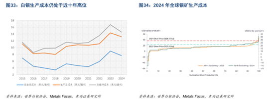 作为白银的常见伴生金属,铜、黄金、铅、锌的现货价格2024年内分别增长7%、28%、7%和20%,因此2024年白银生产成本呈现下滑,但仍处于近十年中的高位。