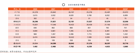 平衡方面来看,根据世界白银协会预测,预计2025年全球白银仍呈短缺格局,短缺幅度较2024年呈现一定收敛,约达3660吨。供给端预计全年增幅达1.5%,其中矿产银预计增长1.9%,再生白银产量降低0.4%。需求方面,以银器、摄影为代表的非工业需求一定程度上拖累总体需求增速,预计全年全球总体需求增速达-1.4%。在供增需减假设下,全球白银仍呈供需缺口,基本面或为银价提供较强支撑。