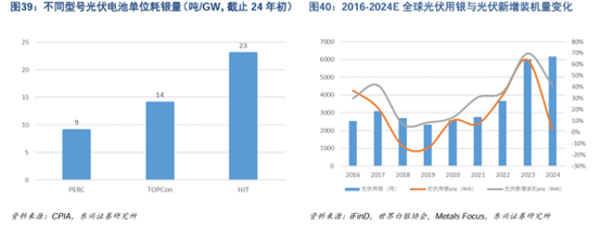 而N 型电池主要包括 TOPCon电池和HJT电池两种,其单位耗银量分别为14吨/GW和23吨/GW,相较P型电池的9吨/GW得到大幅提升。因此随着光伏装机量的提升,光伏对于银的需求量也在提升。