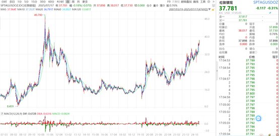 6月5日以来,白银强势突破,银价在小幅盘整后再创新高。7月14日,伦敦银现货一度站上39美元/盎司,创2011年9月以来近13年新高。