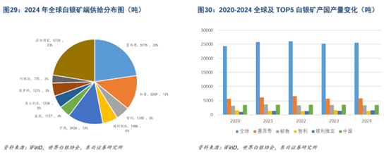 2024年全球白银供给总量约3.16万吨,同比增加1.7%。白银矿端供给区域集中度较高。2024年,全球白银矿端供给总计25497吨,白银矿端供给CR5为60%。其中墨西哥(5775吨,占比23%)、中国(3426吨,占比13%)、秘鲁(3359吨,占比13%)、玻利维亚(1486吨,占比6%)和智利(1342吨,占比5%)为全球前5大银矿供给国。