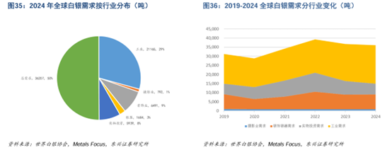 而从需求角度来看,全球白银需求已经进入结构性扩张阶段。全球白银需求2020年后呈现中枢性抬升,2021年以来整体需求规模维持在3.4万吨以上,趋势上来看,近年来白银需求规模呈现边际下降,2024年全球白银总需求同比下降2.9%至3.62万吨,主要受白银实物投资需求规模下降拖累。