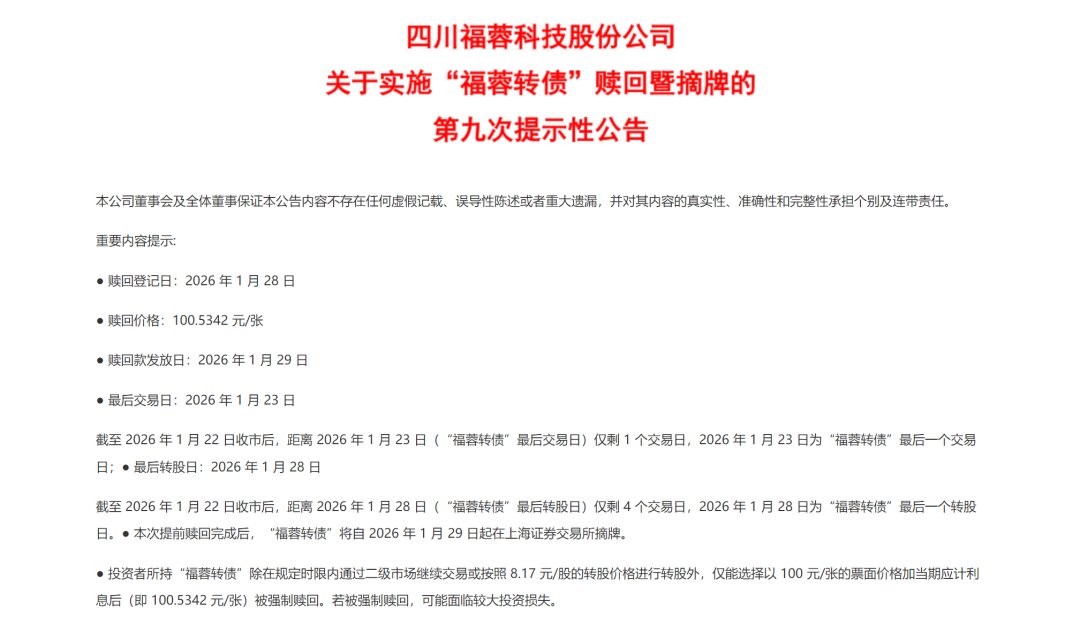 1月22日,福蓉科技发布关于实施“福蓉转债”赎回暨摘牌的第九次提示性公告,提醒投资者1月23日为福蓉转债最后一个交易日,1月28日是最后一个转股日,债券持有人应及时卖出或转股。1月28日收市后,未实施转股的福蓉转债将全部冻结,停止交易和转股。