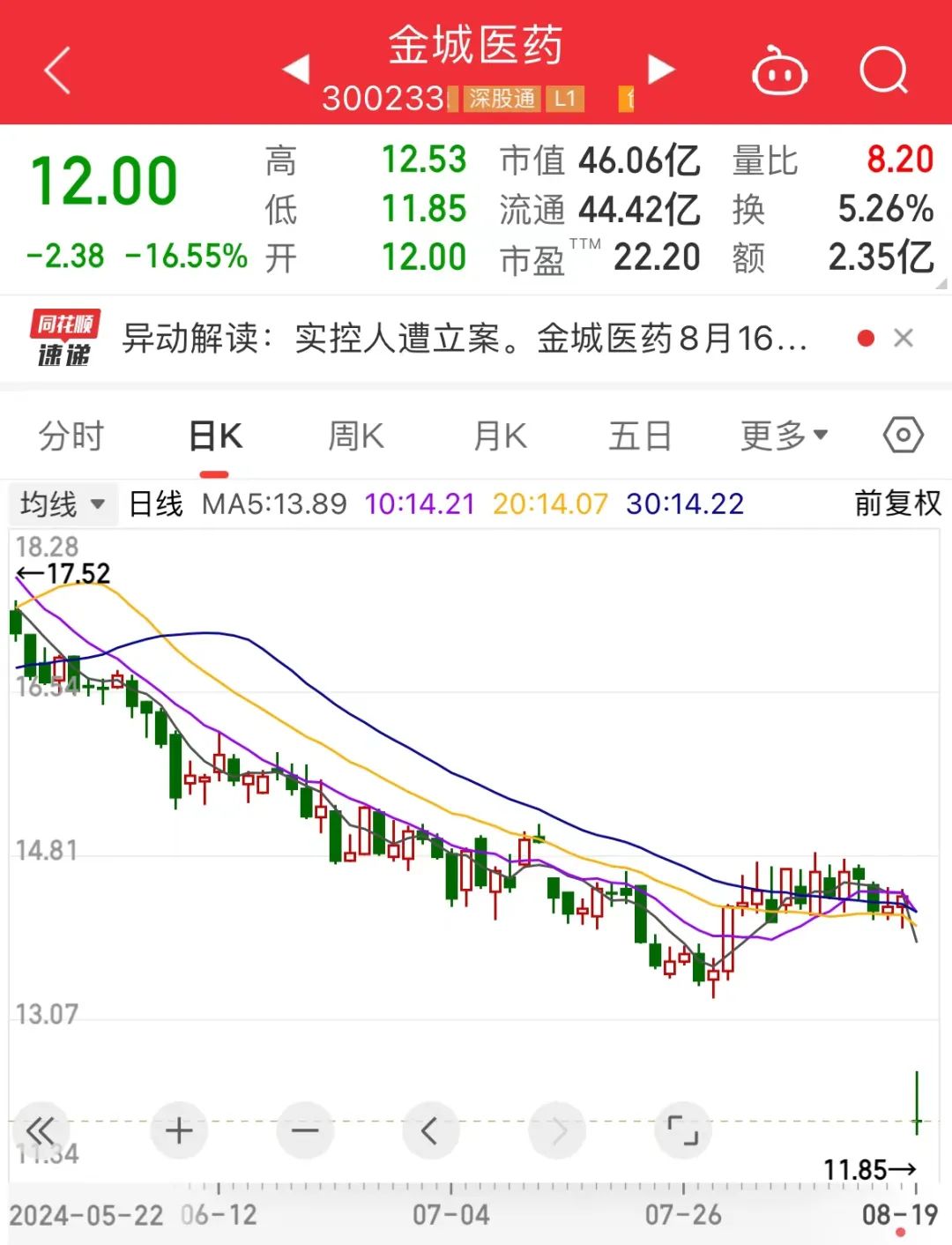 金城医药早盘大幅低开,跌超16%,成交额2.35亿元。8月16日晚间,金城医药发布公告,公司实际控制人、董事长赵叶青于2024年8月14日收到中国证券监督管理委员会(以下简称中国证监会)下发的《立案告知书》。因涉嫌操纵证券市场违法违规行为,根据相关法律法规,中国证监会决定对赵叶青立案。